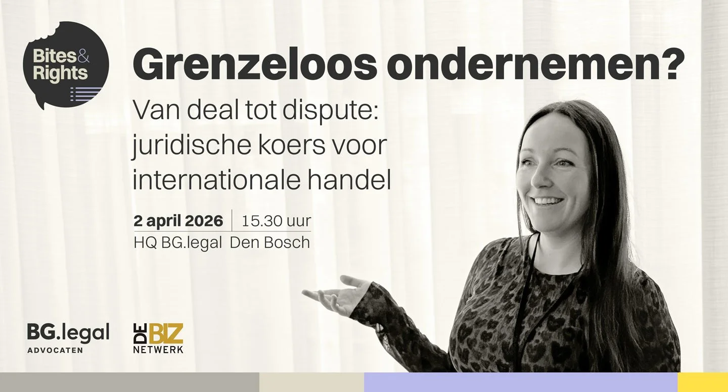 Donderdag 2 april 2026 organiseren wij, samen met BG Legal, een seminar op ons hoofdkantoor in ’s-Hertogenbosch. Twee ervaren ondernemers nemen ons mee in hun praktijkverhalen over internationaal zakendoen. Zij delen openhartig hun ervaringen met kansen, risico’s en onverwachte uitdagingen in het binnen- en buitenland en vooral wat zij daarvan hebben geleerd. Daarnaast zullen vanuit juridisch perspectief praktische handvaten worden geboden die richting geven bij internationaal ondernemen.